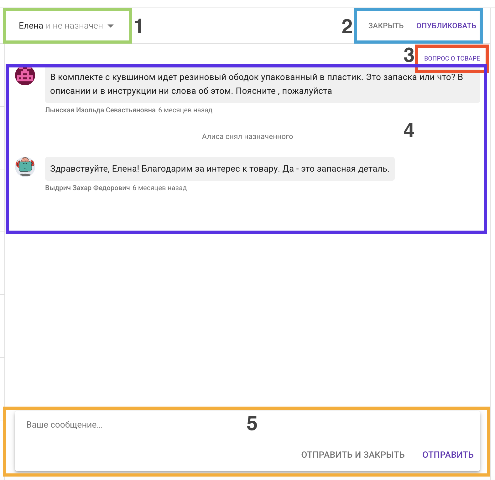 В этом блоке можно посмотреть данные по автору сообщения, товару, по которому был задан вопрос (если источник диалога форма вопроса), участниках диалога, а также строка для ввода тега, с помощью которого можно разметить диалог.