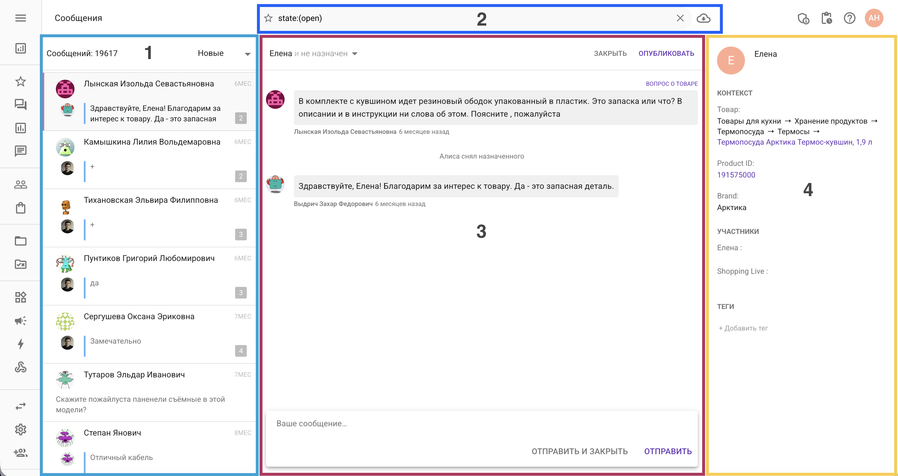 Аналогично с другими разделами (Отзывы, Вопросы и ответы и Опросы), в сообщениях есть строка быстрого поиска, а также продвинутый поиск, с помощью которых можно отфильтровать контент по тексту или каким-то параметрам или атрибутам. Подробнее как это работает можно почитать в этой статье.